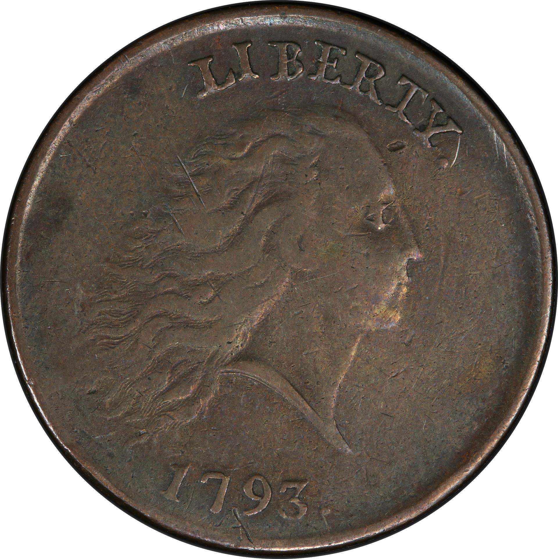 The new Liberty head had long, separate locks blowing even more wildly than those on the Chain coins. The new reverse presented an elegant wreath of elongated leaves resembling laurel, the ancient symbol of victory. Just above the heavy bow appear three-part leaves or trefoils suggesting cotton or even maple leaves. Thrusting outward are hair-thin stems bearing three or four tiny round berries wholly unlike laurel. (Later large cents all bear undeniably laurel wreaths with their large round berries, but no one knows for sure just what plant or plants Rittenhouse was depicting in 1793 on his obverses or reverses. It is possible that the aged scientist had a composite in mind for his elegant wreath, but the truth may never be known).